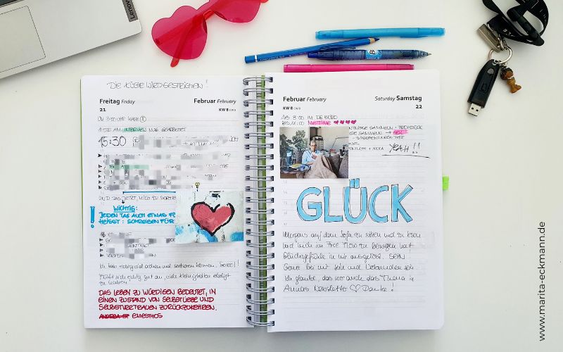 Dafür liegt seit Anfang des Jahres ein großer DIN-A4-Spiralkalender auf meinem Schreibtisch. Zu Beginn wollte ich herausfinden, wo meine Zeit bleibt, inzwischen finden darin auch Tagesreflexionen, Erkenntnisse, Sprüche und besondere Momente ihren Platz. Und da ich jetzt weiß, wie wichtig kleine Auszeiten sind, notiere ich auch diese im Kalenderbuch. Ausführliche Erkenntnisprozesse finden in meinem neuen DIN A4 Notizbuch ihren Platz.
